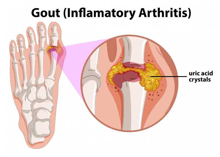 통풍은 요산이 체내에 축적되어 관절에 염증을 일으키는 대사성 질환입니다. 요산은 신체가 퓨린을 분해할 때 생성되는 물질로, 소변을 통해 배출되지만 요산의 과도한 생성이나 신장을 통한 배출 저하가 원인이 되어 혈액 내에 쌓이게 됩니다. 요산 수치가 높아지면 결정 형태로 관절에 침착되고, 특히 발가락이나 발목, 무릎 등 부위에 염증과 함께 극심한 통증을 유발합니다. 이러한 통증은 주로 갑자기 발생하며, 통풍 발작은 몇 시간에서 며칠 동안 지속될 수 있습니다.